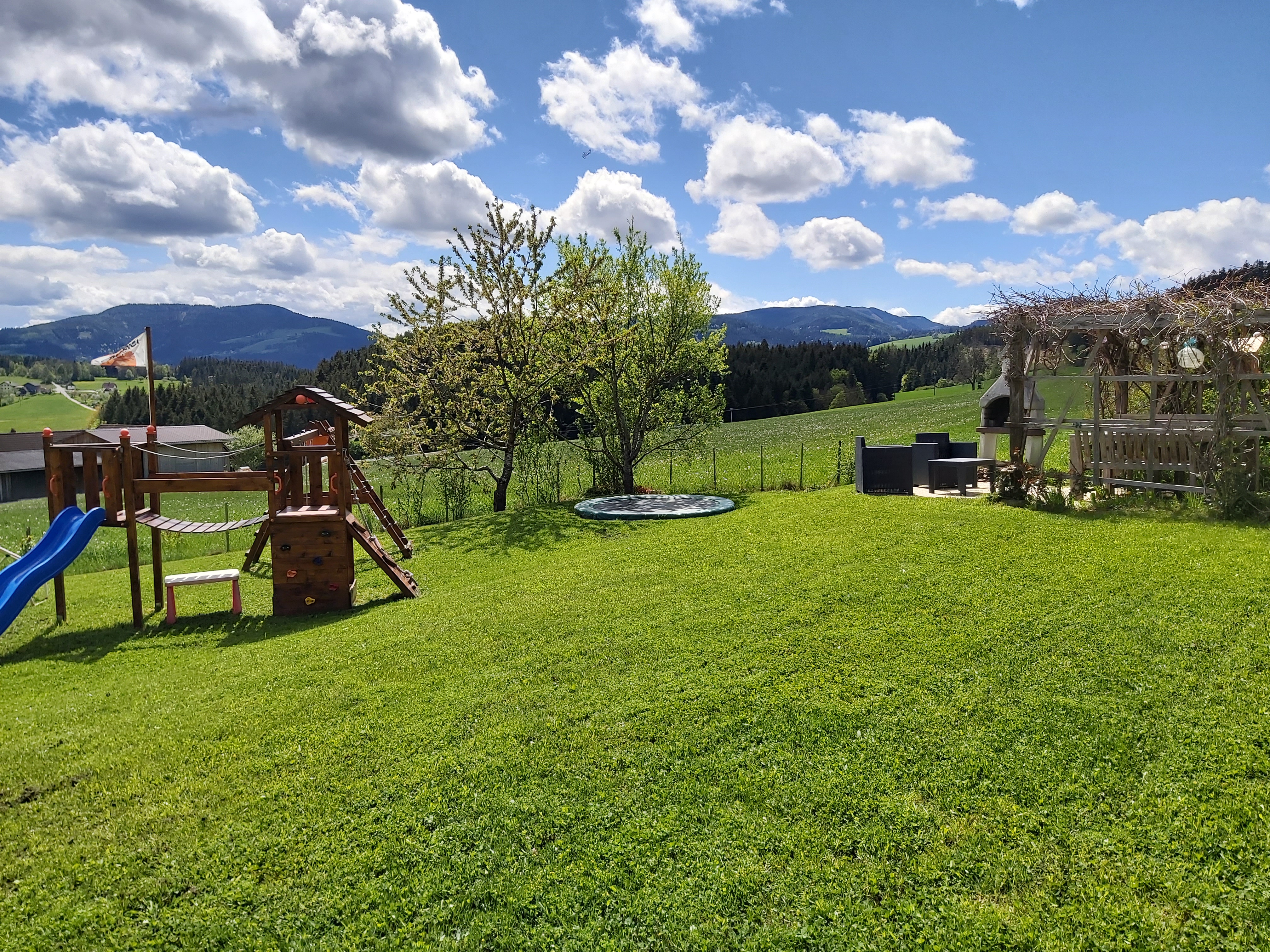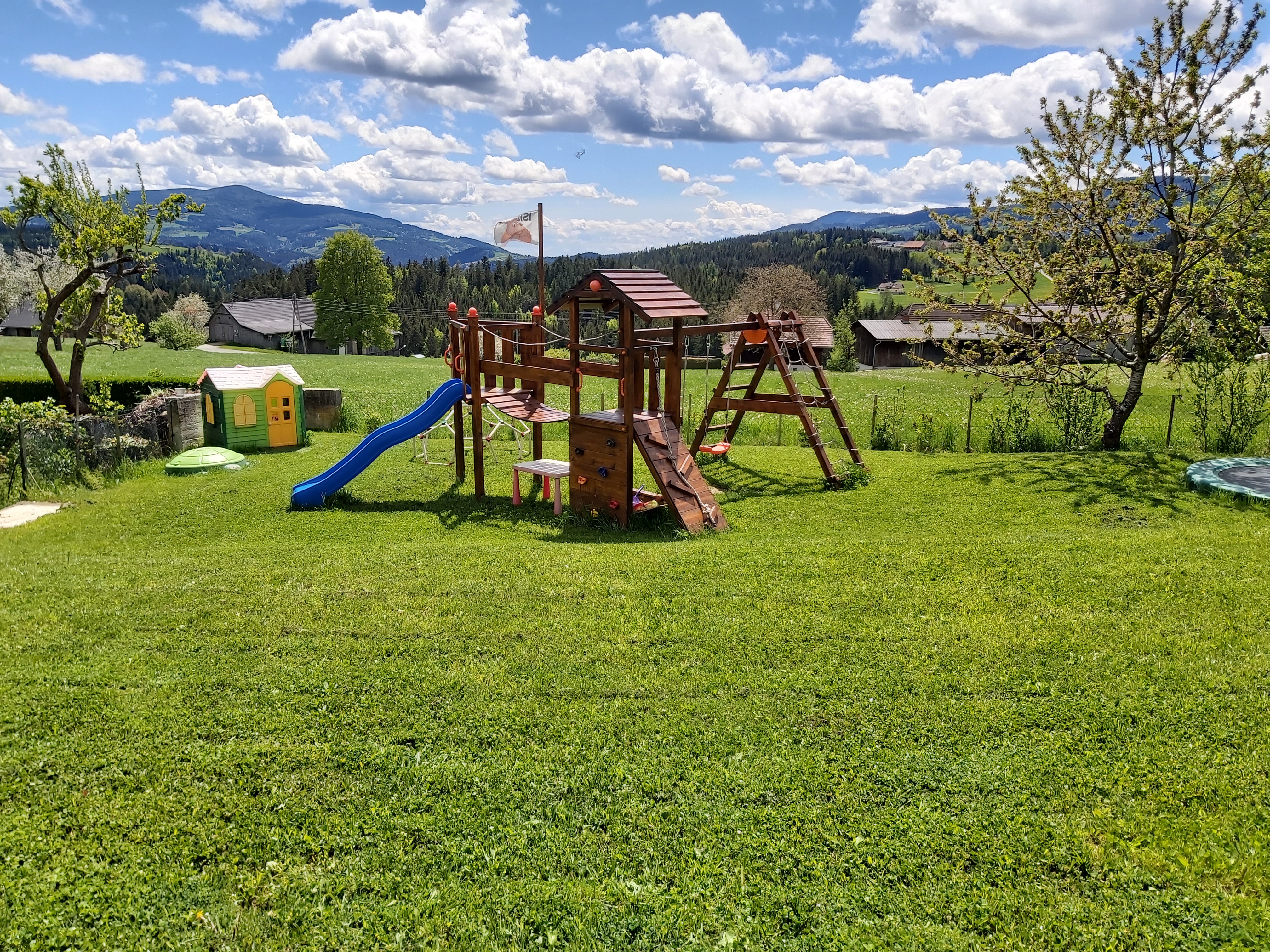 Für die Kinder gibt es einen schönen Spielplatz im Garten mit Trampolin, Schaukel, Rutsche, Klettergerüst, Sandkasten und vielem mehr.